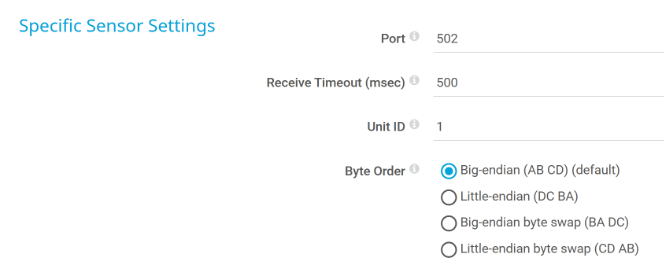 The Modbus TCP Custom sensor connects to a Modbus Transmission Control Protocol (TCP) server and monitors up to ten returned numeric values.