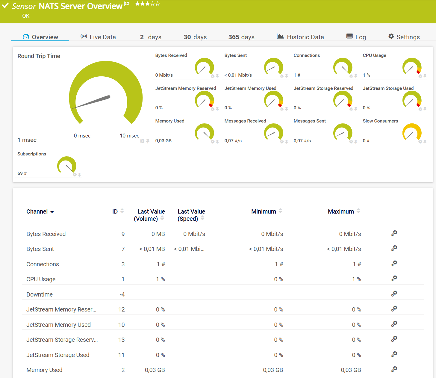 The NATS Server Overview sensor monitors the status and traffic of a NATS server.