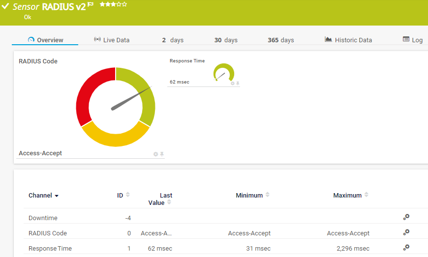 The RADIUS v2 sensor monitors a Remote Authentication Dial-In User Service (RADIUS) server according to RFC 2865.
