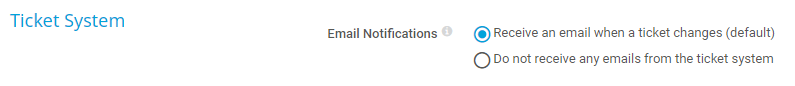 Receive an email when a ticket changes (default): The user receives an email each time a ticket is assigned to the user or to the user group they are a member of, or if a ticket is changed. If the user edits tickets that are assigned to them or the user group they are a member of, or if they assign a ticket to themselves or their user group, they do not get an email.